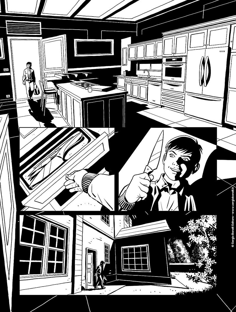 Giardo sceglie un’inchiostrazione molto accentuata, utile a rendere più cupa l’intera storia e ad affrontare alcuni passaggi che tendono all’horror. La gabbia è più movimentata: quasi ogni tavola è costruita intorno a un’illustrazione a tutta pagina con vignette regolari sovrapposte, soluzione spesso apprezzata in Dragonero.