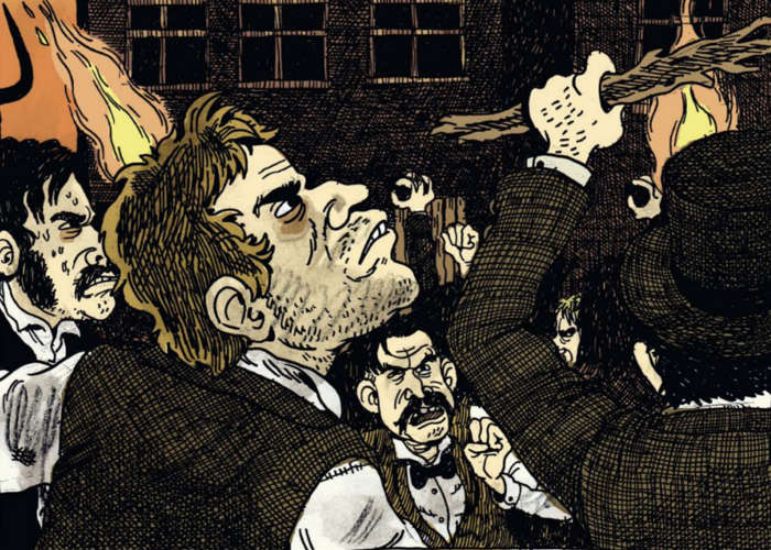 Altra storia notevole è La morte di Elijah Lovejoy. Lovejoy, nato il 9 novembre del 1802, è stato uno dei più importanti giornalisti statunitensi grazie alle sue battaglie per la libertà di stampa e per la difesa dei diritti delle minoranze etniche. Van Sciver racconta la notte della sua morte, avvenuta il 7 novembre del 1837 durante l’attacco di un nutrito gruppo di fautori della schiavitù contro l’Observer, il giornale di Lovejoy. La rabbia degli assedianti, la strenua difesa dei giornalisti, la fuga dalla sede del giornale ormai distrutta in una serie di vignette macchiate del sangue di Lovejoy, tutto concorre alla costruzione di un racconto che diventa un vero e proprio manifesto contro l’intolleranza e l’ignoranza di quel secolo, e che purtroppo non abbiamo ancora abbandonato.