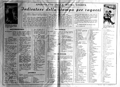 Da queste pagine risultava che 178 albi dovevano essere messi al bando ed erano assolutamente sconsigliati da leggere, 34 andavano letti con cautela, 43 erano “leggibili” – non eccezionali, ma almeno non davano insegnamenti negativi ai bambini – e 24 consigliatissimi, perché erano fumetti di stampo prevalentemente cattolico.