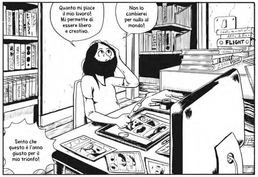 E in questo racconto sferzante nulla viene risparmiato: non i rapporti famigliari, in cui si annida la radice della dipendenza e delle false aspettazioni, tutte puramente materiali, non le piccole meschinità della nuova povertà, quella che vuole guidare una Mercedes guadagnando sull’accoglienza, o le criticità di un sistema lavorativo, in particolare quello editoriale, fatto di sfruttamento e mancato riconoscimento, sia economico che professionale che rendono il lavoro del fumettista soggetto a stress, delusioni e insicurezze personali. Una frustrazione che esplode ai consueti pregiudizi verso questa professione, all’essere accomunato con autori molto lontani dalla propria sensibilità, una frustrazione che scivola verso la rassegnazione al commento di una dottoressa che consiglia di “cambiare lavoro”.