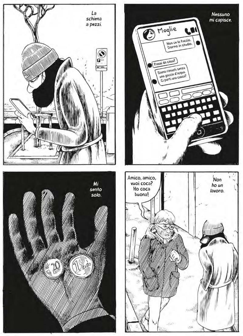 Basterebbero queste pagine per giudicare Italo, per certi versi. In pochi passaggi Filosa ci dice già tutto del suo fumetto, dal contesto dell’opera (la dipendenza e le sue declinazioni) al suo tono in perenne equilibrio tra il drammatico e il comico, tra il serio e l’assurdo; in queste tavole incontriamo e già comprendiamo il protagonista, vediamo incontrarsi culture e narrazioni da oriente e occidente, attraverso la ricerca sul tratto e sulla scansione delle vignette.