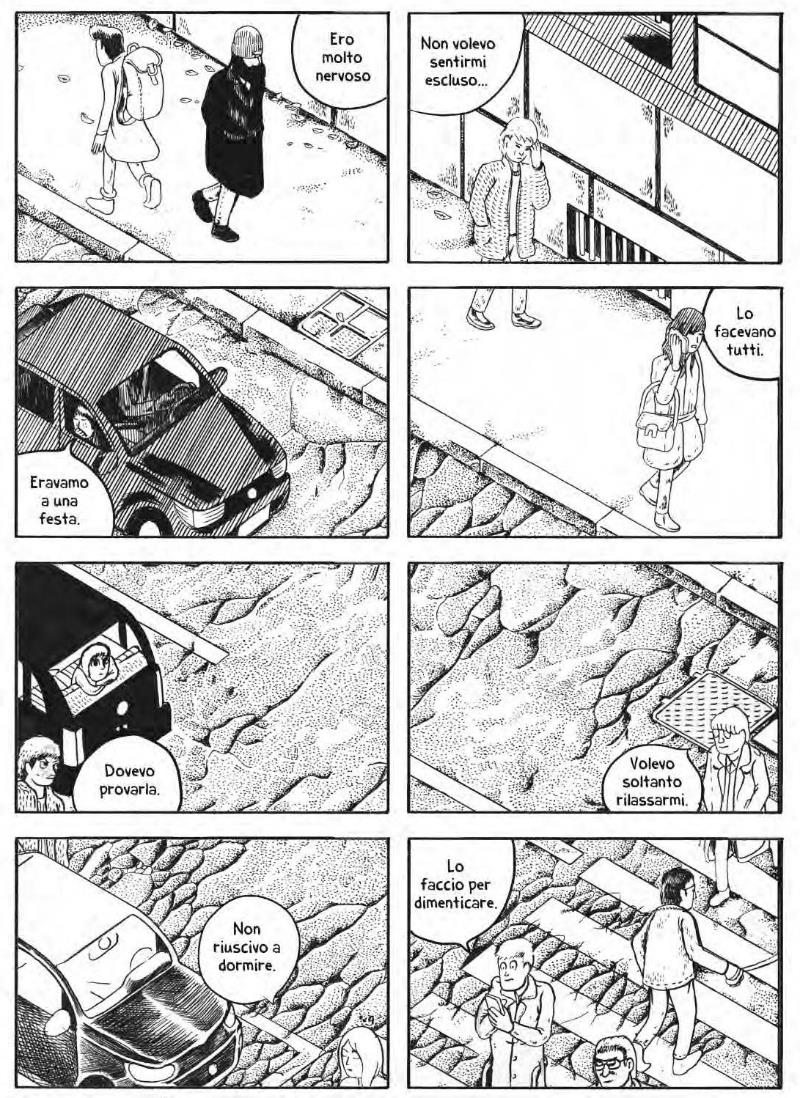 La dipendenza ha molte facce e tante scuse, spesso apparentemente sensate (“Non riesco a dormire”, “Lo faccio per dimenticare”, “Ero molto nervoso”), ancor più spesso puerili se viste da fuori, ma che riescono ad attecchire in chi cerca in tutti i modi di giustificarsi con sé stesso (“Yogurt”, “Buchi neri”, “New wave del fumetto”). Sono questi i molteplici e multiformi pensieri che affollano le comparse di una serie di pagine di Italo di Vincenzo Filosa, forse le più straordinarie e coinvolgenti di tutto il volume: una serie vignette sempre più piccole e fitte suddividono stralci di strade di Milano. La ripresa a tutta tavola si frammenta, si suddivide prima 8, poi 16, poi 32, poi 64. Si riempie di personaggi, di baloon, di bizzarrie, mentre il protagonista le attraversa indifferente.