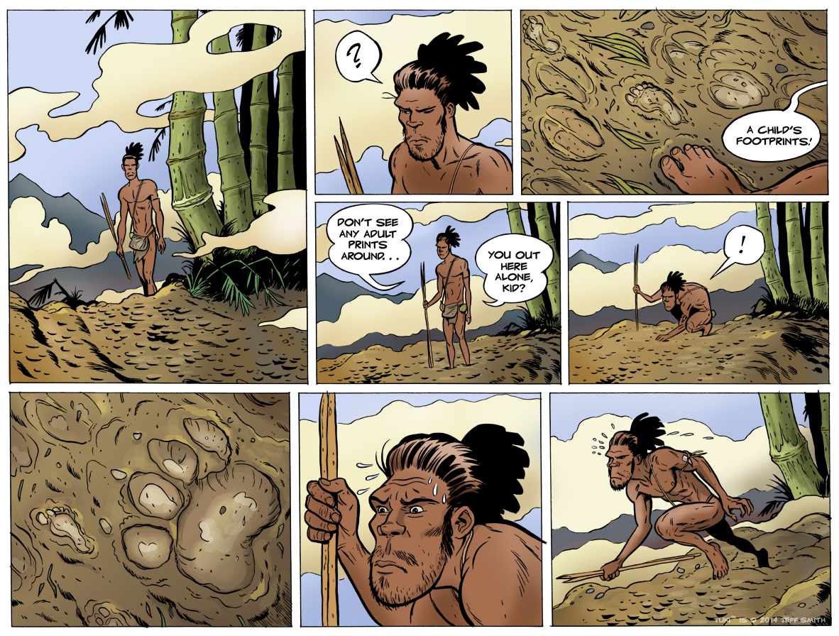 Jeff Smith spinge molto, in questo inizio della sua storia, sulla descrizione di una delle reali preoccupazioni principali dell’uomo primitivo, la ricerca continua di una fonte di sostentamento alimentare. Un aspetto “veritiero” nella narrazione che l’autore cerca di innestare sui paradigmi più fantasiosi del racconto.