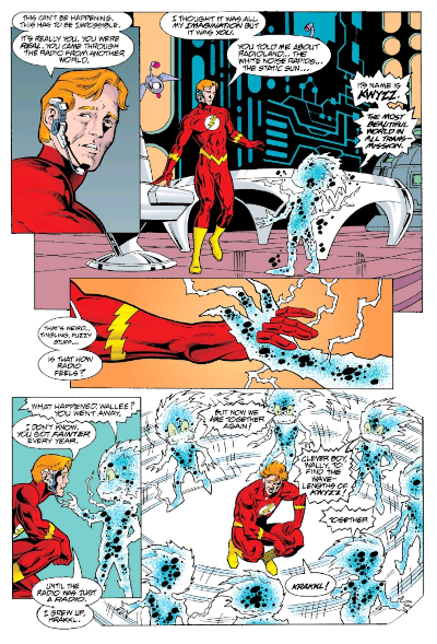 Questo approccio rende il crossover di rapida lettura ma anche rapidamente dimenticabile e deludente. Nella sua gestione delle avventure di Sonic, Ian Flynn ha costruito le migliori storie sfruttando le tensioni fra i personaggi, mettendoli spesso in situazioni che fanno emergere i contrasti fra le loro visioni del mondo (esemplare l’arco di Eggman/Mr. Tinker, raccontato nei primi due volumi della serie regolare). Era quindi ragionevole aspettarsi un simile approccio anche per questo incontro fra i due universi narrativi – sfruttare le differenze al di sotto delle apparenti somiglianze per raccontare qualcosa di particolare dei personaggi – ed è un peccato che, invece, ci si sia accontentati di un divertissement, poco più di una passerella, che, confronto inevitabile, risulta molto meno intrigante dell’omaggio proposto da Grant Morrison e Mark Millar in The Flash – The Human Race (The Flash #136-138, 1998), nel quale lo speedster alieno Krakkl è chiaramente ispirato a Sonic (Fig. 3).