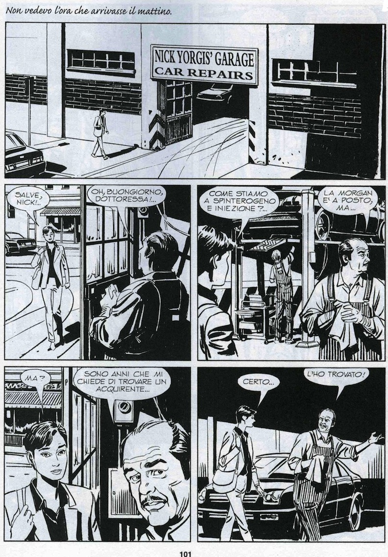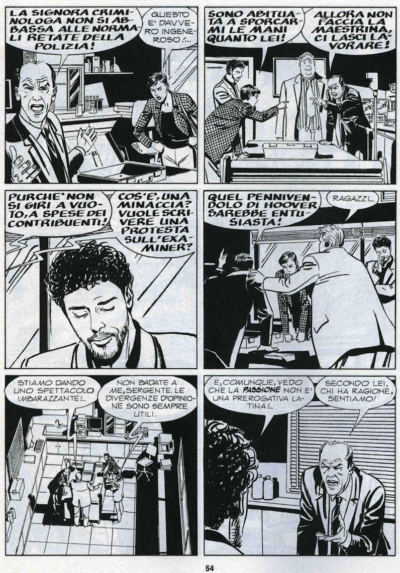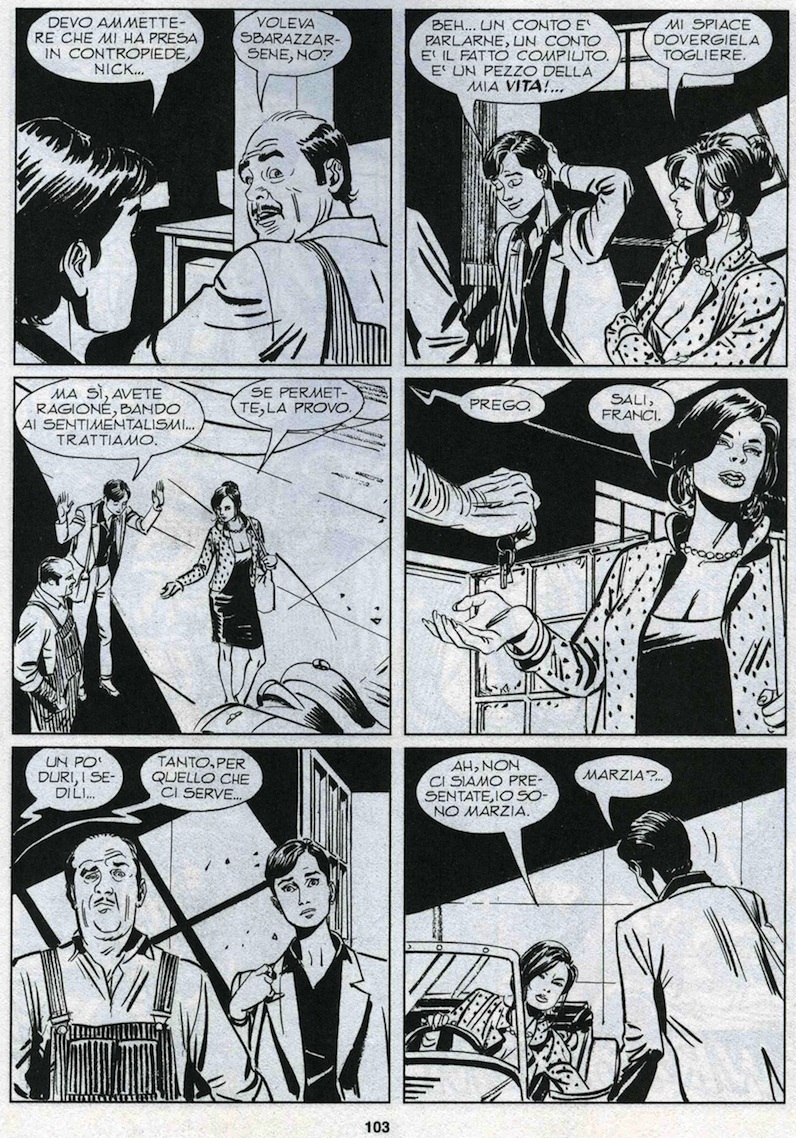 La griglia portante e dominante è quella delle sei vignette per pagina, che alterna per lo più la vignetta singola (un sesto della pagina) a quella doppia in orizzontale (un terzo della pagina). Una struttura così regolare e comprensibile permette a sceneggiatori e disegnatore di modulare diversamente i tempi della successione degli eventi all’interno delle singole vignette. La griglia, per così dire, sparisce, la pagina perde importanza, per dare risalto a quanto avviene all’interno di essa.