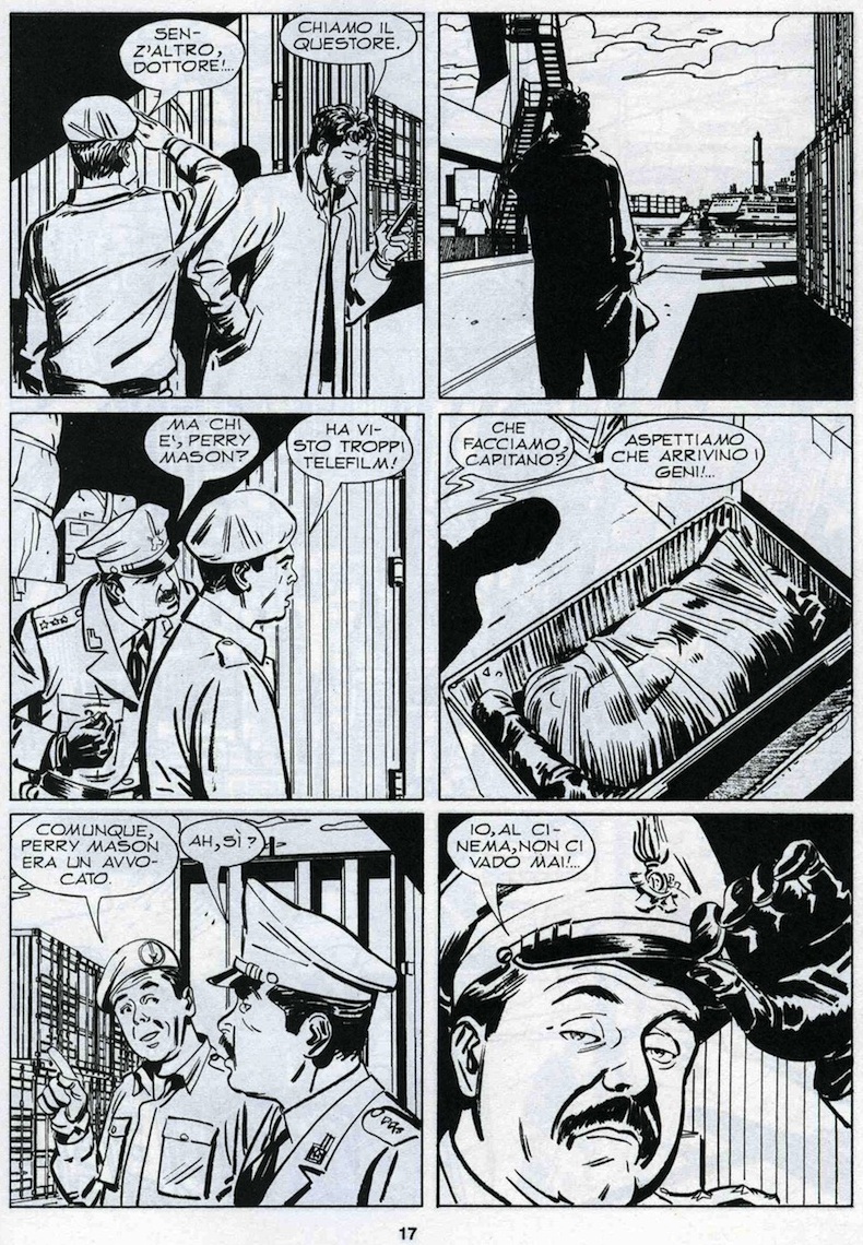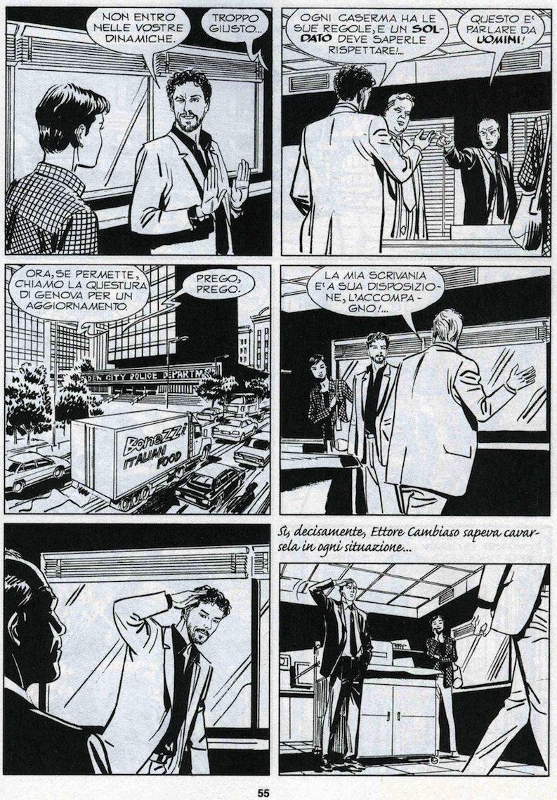 Tutta la sequenza di apertura di “Cadavere in trasferta”, ambientata nel porto di Genova, che ci porta prima alla scoperta del cadavere citato nel titolo e che metterà in moto tutti gli avvenimenti, e poi alla presentazione del nuovo personaggio Ettore Cambiaso, è da antologia, proprio in relazione a quanto sopra descritto. Una lettura a più livelli permetterà in particolare di cogliere le numerose sfumature e i tantissimi particolari che la costituiscono.