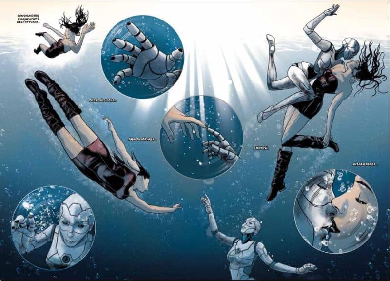 A rendere più efficace la storia abbiamo poi due disegnatori professionali, entrambi dallo stile solido e realistico, coadiuvati da colori tanto freddi quanto adatti al clima che si respira nel fumetto, e capaci di ritrasmettere le sensazioni di questo futuro algido in cui tutto è perfetto ma privo di calore. Tecnicamente ineccepibili le vignette dal taglio americano dei primi due capitoli, opera di Mattia De Iulis, chiare nella messa in scena ed estremamente “vere” senza risultare mai troppo fotografiche o stucchevoli, piacevoli anche a uno sguardo superficiale. Uno stile linea chiaro a volte eccessivamente statico, e che a tratti perde di comprensibilità, ma che tuttavia non cede alla tentazione di esagerare con inquadrature e posture, e in definitiva risulta accattivante e ricco.