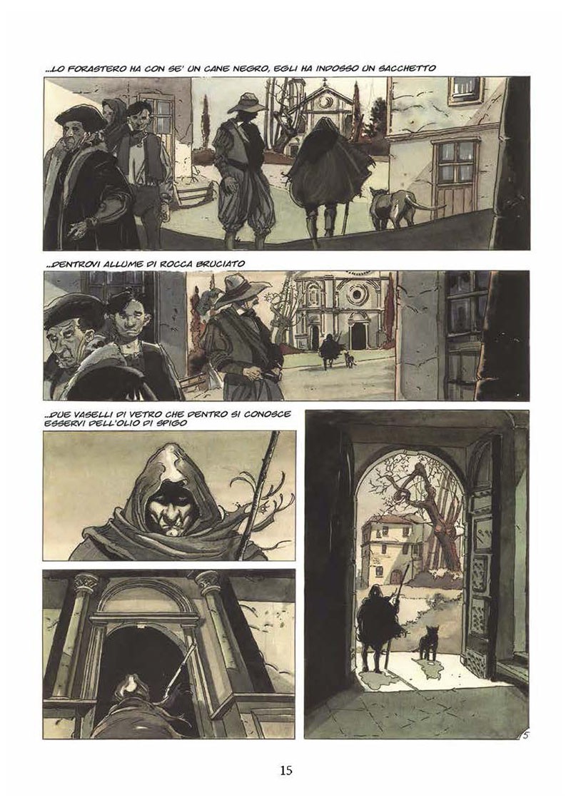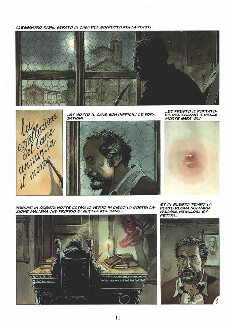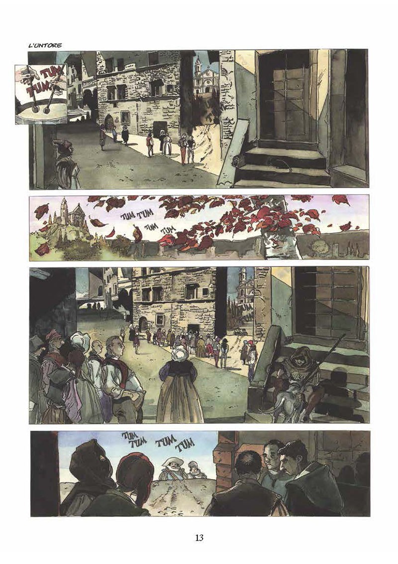 L’attenzione alla resa dell’ambientazione storica fin nel particolare più minuto, tanto nel vestiario quanto negli ambienti e nelle architetture, ha accompagnato Tisselli per tutta la sua carriera e in queste pagine si palesa da subito in scorci architettonici cittadini e interni di chiese e abitazioni – ricche o povere che siano – che riverberano il periodo storico dell’ambientazione. Queste, assieme alla cura per l’abbigliamento e l’acconciatura dei personaggi, amplificano il grado di realtà del racconto, in quello che a tutti gli effetti appare essere lo scopo ultimo dell’autore: mettere in scena con il linguaggio del fumetto un resoconto storico accurato e approfondito, frutto di studio, in cui la mediazione narrativa dell’elemento fantastico incarnato dall’untore non annacqua la realtà di eventi accaduti.