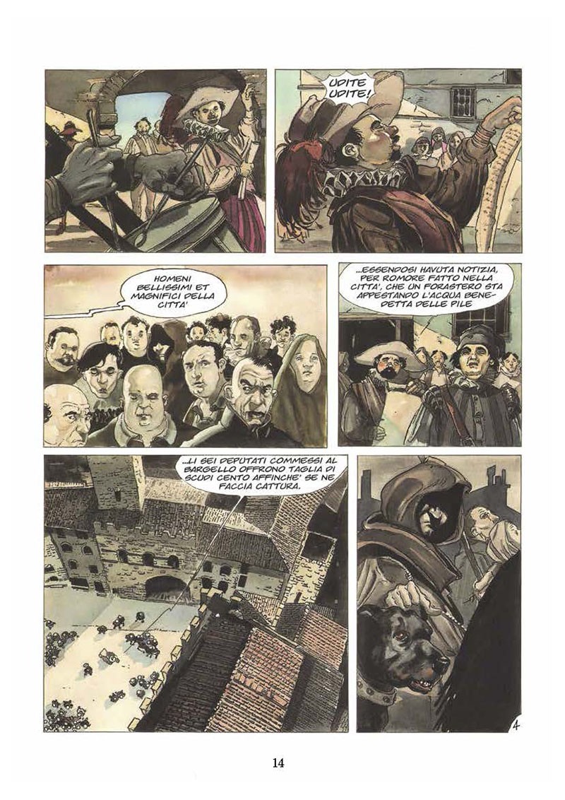A questa efficace intuizione Tisselli somma la scelta dell’uso di un linguaggio coevo agli eventi narrati, un “volgare” italiano del ‘600, contaminato dal dialetto locale, con cui parlano tutti i personaggi della storia – più o meno correttamente in base all’estrazione sociale – e che immerge ancora di più i lettori in quell’epoca lontana, alla cui visualizzazione contribuisce il dettaglio grafico del pennino e dei pennelli dell’artista.
