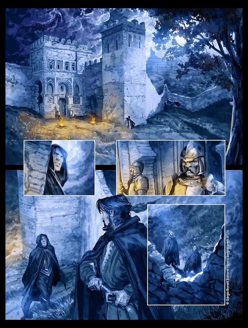 Le cromie definiscono con precisione estrema fisionomie, vestiti, ambienti e oggetti e si esaltano nella restituzione grafica delle splendide architetture della Spagna moresca. Conoscendo il metodo di lavoro di Manfredi e la mole di materiale iconografico che ogni volta invia ai suoi disegnatori, sicuramente Lucchi avrà avuto a disposizione decine di riferimenti visivi. Ciò non toglie l’ottima ricostruzione delle complesse e ricche architetture e dei giardini dei palazzi seicenteschi di Siviglia, con livelli di dettaglio degni di elaborati tecnici esecutivi.