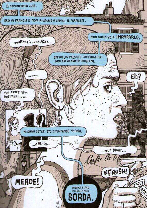 Nel primo racconto, Scritto sulle labbra, siamo subito catturati dalla presenza della protagonista che ci guarda attraverso le pagine e ci invita, o quasi ci costringe, a leggere i movimenti delle sue labbra, a seguire la storia di come ha scoperto di essere sorda e dei disagi che ha dovuto affrontare. La sua schiettezza è disarmante, grazie allo splendido tratto di Paolo Bacilieri e alla sincera narrazione di Tito Faraci, e in un attimo è come se perdessimo l’equilibrio, entrando davvero nel suo mondo.
