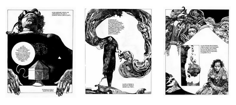 Un esempio di questa complessità labirintica è testimoniato dal rapporto tra “disegnato” e “scritto” all’interno della pagina. A uno sguardo distratto, la netta separazione operata tra le aree disegnate e le aree occupate dai testi (spesso confinate nel bianco senza balloon) potrebbe ricordare la dimensione del racconto illustrato, più che quella del fumetto tout court.