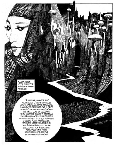 La nozione di tempo mitico ci aiuta a capire come poi questa vasta serie di dispositivi che possiamo analizzare in ogni singola tavola, cooperino poi a caratterizzare in maniera del tutto speciale i ritmi del singolo racconto e, in seconda battuta, dell’intera serie di racconti che compongono l’epopea fumettistica di Sharaz-De.