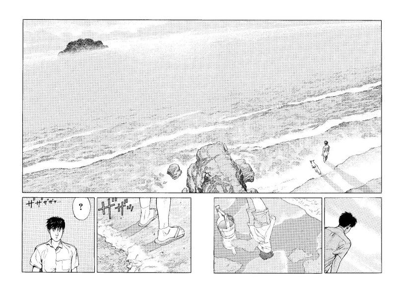 La quarta vignetta inquadra i piedi del protagonista, facendo intuire il fatto che lui sia rivolto verso la spiaggia. Il passaggio dalla precedente posizione, quella in cui volgeva lo sguardo verso l’isola, e questa non viene presentato al lettore, quasi come se fosse avvenuto all’improvviso, sconvolgendo quindi l’immagine mentale che si era venuta a creare sulla posizione del corpo e degli altri elementi. Ciò si lega così alla vignetta successiva, in cui un confuso Yosuke sembra domandarsi cosa stia accadendo, un po’ come il lettore, il cui senso di spaesamento riflette quello del protagonista.