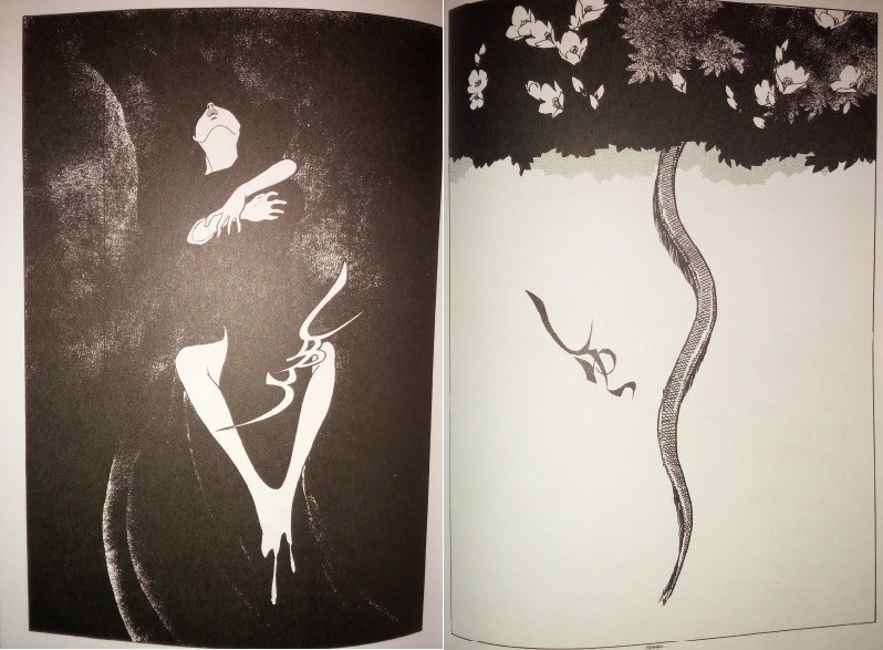 Le pagine 100 e 101, nonostante non siano un’unica splash page ma due separate, è necessario discuterle in coppia, visto il loro legame. In queste due tavole, Kamimura introduce due temi visivo-concettuali che poi riprenderà più avanti: il simbolismo cristiano e lo scontro tra sacro e profano. A pagina 100 si vede infatti un serpente (il peccato) infilarsi in quello che sembra un giardino fiorito (l’Eden), mentre in quella successiva ci si trova di fronte all’estasi di piacere della protagonista. Le due pagine, oltre a essere collegate dalla stessa onomatopea, che da una parte indica il frusciare delle foglie al passaggio del serpente e dall’altro la penetrazione, si distinguono per un contrasto essenziale: a destra, sfondo bianco e banda nera in alto, come segno di contaminazione del serpente, a sinistra sfondo nero e figura bianca, come segno della purezza costantemente marchiata dal decadimento. La somma di un’immagine riconducibile a temi sacri (pagina 100) e di una riconducibile al profano (pagina 101) crea un ulteriore livello di lettura della vicenda, mostrando un senso del destino tragico e una razionalità (forse si potrebbe parlare anche di fiducia o fede in se stessi) che sfuma al contatto con la passione.