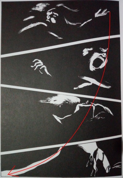 La prima tavola che mi interessa analizzare è pagina 31, composta da quattro vignette orizzontali non perfettamente rettangolari: questa particolare composizione conferisce il massimo dinamismo a una scena di estrema drammaticità. Kamimura decide di illustrare la scena di uno stupro con un taglio espressionista, consistente in un netto contrasto tra nero e bianco, dove a prevalere è il primo, espressioni lancinanti e una scelta delle inquadrature che privilegia i dettagli del volto e delle mani. Tutto ciò scombina la visione del lettore, conferendo un senso di disturbo a chi sta osservando la tavola, ma senza effettivamente mostrare nessun dettaglio eccessivo o troppo morboso. Il senso di lettura viene poi guidato da una linea immaginaria che collega la mano della prima vignetta alla silhouette del corpo dell’ultima, fornendo così un ritmo fluidissimo, quasi che il dolore sia allo stesso tempo ferita da dimenticare in fretta e perenne cicatrice nell’anima: uno stigma indelebile, evocato nel segno di un profilo che protende lo sguardo verso la pagina successiva.
