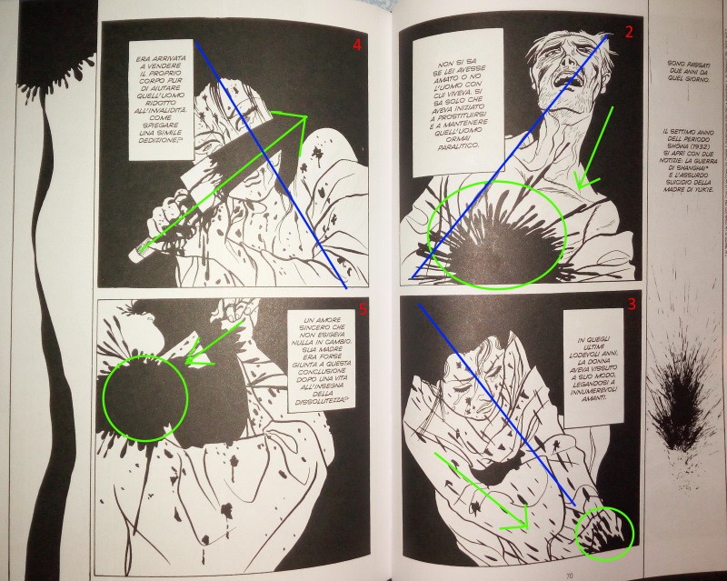 Le pagine 70 e 71, costruite specularmente ( due vignette verticali e quattro quadrate), risultano molto interessanti sia per la tipologia di segno usata da Kamimura sia per l’ennesimo contrasto di linee che tende a creare. L’autore utilizza un tratto molto pop dall’inchiostrazione pesante, in contrasto sia con la situazione che mostra, un omicidio-suicidio, sia con il tipo di tratto usato nelle precedenti pagine, molto più elegante, qua combinato con violente macchie di inchiostro che materializzano lo shock della vicenda (e del lettore). Inoltre, bisogna notare alcuni dettagli fondamentali sulla direzione dello sguardo impressa dal movimento e sul contrasto delle linee. A pagina 70, nelle vignette 2 e 3, lo sguardo di chi legge viene accompagnato verso il basso, rispettivamente dal sangue che sgorga dalla pancia dell’uomo, in cui il collo stabilizza la visione di chi legge, e dall’accoltellamento della donna, che pone come punto focale le mani che impugnano il coltello (che comunque non viene mostrato, scelta interessante che ha come fine lo sconvolgimento del lettore nella pagina successiva, in cui viene mostrato nella sua completezza). A pagina 71, invece, nella vignetta 4 la posizione del coltello crea una tensione visiva, puntando in maniera diametralmente opposta rispetto al bilanciamento del corpo verso sinistra della vignetta stessa (e anche della 3): è come se questa volta Kamimura ci volesse mostrare palesemente l’arma del delitto, in tutta la sua aura di malvagità, che nella pagina precedente era stata occultata, destabilizzando il senso registico del quadro con la sua posizione anomala. La vignetta 5 è un profilo con il focus sul collo trafitto, una posizione che si distanzia volutamente dalle altre e che permette di vedere solo in parte l’espressione di dolore della madre di Yukie, come se un ultimo velo di pudore scendesse in fine sull’intera scena, segnalato dallo stacco di montaggio su una goccia di sangue che cola sul vestito e sull’animo, non più candidi, della donna.
