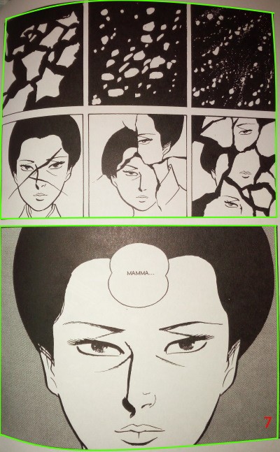 Pagina 82 presenta alcuni elementi importanti. Il primo è il ritmo del montaggio, che propone una transizione tra fiocchi di neve e pezzi di carta, e scandisce una sequenza di sei vignette quadrate in cui il nero lascia posto al bianco, ovvero il vuoto della memoria che viene completamente colmato da un’immagine (in questo caso il volto della madre di Yukie): un’immagine così potente che occupa da sola una vignetta, la 7, che per grandezza potrebbe contenere tutte le altre, fatto che strutturalmente ne ribadisce l’importanza. Il secondo è la costruzione della tavola, che favorisce questa interpretazione, visto che il volto viene ricostruito solo nell’ultima vignetta, come se le sei precedenti più piccole non solo mostrassero i pezzi dell’immagine, ma metaforizzassero anche i frammenti della memoria.