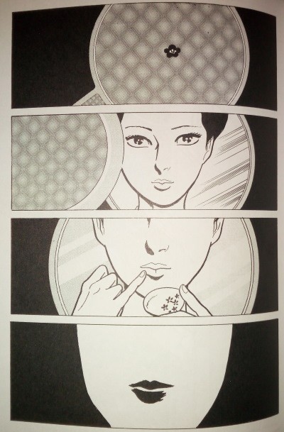 A pagina 85, formata da quattro vignette orizzontali geometricamente identiche, Kamimura propone un’inquadratura a camera fissa, fattore che genera un particolare ritmo dal passo misurato ed esemplifica bene la gestione del contrasto tra vuoti e pieni e la reiterazione di forme ed elementi ricorrenti. Lo specchio, oggetto che richiama la religione e mitologia (lo specchio è uno dei tre tesori sacri che costituiscono le insegne imperiali del Giappone), la letteratura (il famoso racconto storico Ōkagami, titolo che letteralmente significa “grande specchio”) e l’estetica giapponese (è un elemento frequente negli ukiyoe), è simbolo della purezza di Yukie e della sua identità frantumata. Questi suoi simbolismi vengono rafforzati dalla forma rotonda, in completa armonia con la rotondità del volto e degli occhi della protagonista, a cui si somma la forma ovale del rossetto. L’ultima vignetta, nel suo minimalismo, richiama la dissoluzione dell’identità precedentemente citata, dove solo un elemento, il rosso delle labbra, viene esaltato, mentre tutto il resto scompare, compresa la tridimensionalità del disegno: questo indica l’emergere della sensualità e sessualità, che, con la forza del loro istinto, sopprimono ogni forma di razionalità.