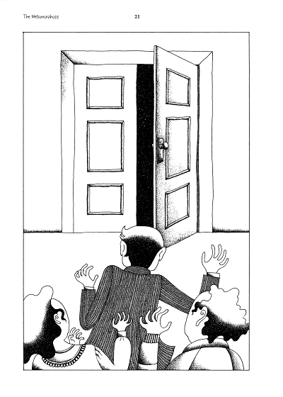 Uno dei punti fondamentali, che più i Nishioka mutuano da Kafka, è l’occultamento dell’animale: Gregor Samsa è un insetto, ma nessuno lo vede nella sua nuova forma, né i personaggi del fumetto, né il lettore. La sua mostruosità, la reificazione della sua alienazione, non è visibile, perché la distanza tra uomo e bestia è diventata incommensurabile. Come scrive Giannetto in Note per una metamorfosi: “la metamorfosi kafkiana segna la fine della parabola di un tema mitopoietico antico che percepiva come naturale la trasformazione uomo-animale”. I Nishioka in questo senso ci pongono di fronte a una stanza completamente buia, di cui solo a tratti scorgiamo l’arredamento, e in questo frangente, la porta della stanza di Gregor, socchiusa o aperta, assume il concetto di “soglia”. La “soglia” è sia ingresso a un mondo ulteriore, un Altrove connotato diversamente dalla realtà, sia limite, confine insuperabile o da non superare, perché la possibilità di esserne risucchiati è fortissima. Gregor trasformato in insetto vive nell’Altrove e non c’è alcuna possibilità che lui possa tornare alla realtà, alla vita normale. Le estenuanti inquadrature frontali sulla porta non fanno che rimarcare questo, riportando alla mente la Zona del film Stalker di Andrej Tarkovskij, solo che di segno opposto: se la Zona può esaudire i desideri più intimi, la stanza di Gregor è un buco nero che li annulla, spezzando la vita.