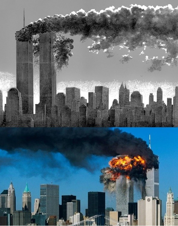 Nel fumetto di Urasawa Naoki (2008-2016), precisamente al capitolo 139, compare una doppia splash page che rappresenta il momento in cui la Torre Sud viene colpita dal secondo aereo. Urasawa disegna realisticamente l’evento, quasi con piglio cronachistico seppur in una storia mistery con elementi fantastici, prendendo come spunto una nota foto di quegli attimi, ribaltandola e cambiando prospettiva. Quello che più colpisce non è tanto la dimensione dello spazio rappresentato in rapporto alle pagine utilizzate, quanto la densità del fumo: quel misto di retini e tratteggi riescono sia a fornire una specificità materiale al fumo sia la metaforica cupezza del momento. Il bianco che sembra strabordare dal fumo, che può essere inteso tecnicamente come un riflesso della luce che schiarisce il fumo stesso ma simbolicamente come la verità nascosta dietro il caos – elemento fondante della serie, così come la riscrittura della Storia e le teorie del complotto – è l’unico fattore che cerca di sabotare dall’interno la natura “antinarrativa” di quest’immagine, che presenta un evento invece di raccontarlo. Billy Bat gioca molto su questo e, attraverso le immagini, riflette sulla dicotomia tra narrazione e presentazione: di volta in volta ci troviamo di fronte a immagini che raccontano e presentano, oppure fanno solo una delle due cose. Questo avviene perché credo che il rapporto con la Storia, la sua rappresentazione così im-mediata, sia il modo in cui Urasawa mette il lettore di fronte a uno specchio distorto del passato, una sorta di doppio fantasmatico trasposto su carta, che non può essere solo narrativo o solo “presentativo”, confermando la forza intrinseca dell’opera.