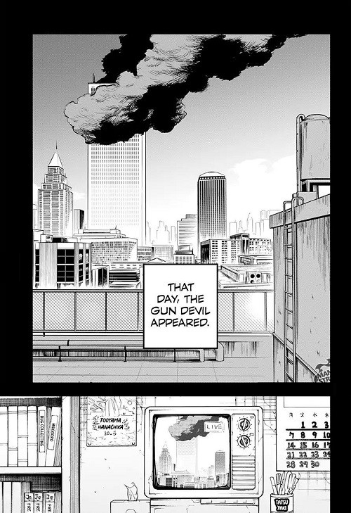 In Chainsaw Man le cose si fanno più complesse. In una pagina del capitolo 13, si vede nella prima vignetta un grattacielo da cui esce fumo dalla parte alta e nella seconda lo stesso evento visto attraverso la televisione; tutto ciò subito dopo il racconto di come negli Stati Uniti un grosso attentato terroristico abbia portato alla nascita del Diavolo apparentemente più forte. Nonostante la serie sia ambientata nel 1997, è chiaro come Fujimoto Tatsuki utilizzi l’immaginario visivo dell’11 settembre per plasmare a livello visivo e narrativo questa sequenza. Tuttavia, l’autore compie un passo ulteriore, perché con la seconda vignetta amplifica il senso del suo discorso ponendo riflessioni per nulla banali: così come abbiamo osservato l’11 settembre attraverso la televisione, allo stesso modo l’attacco terroristico che porta alla comparsa del Diavolo Pistola è osservato dallo stesso mezzo. Entrambi sono mediati e filtrati e coglierne il senso o individuare il nemico è impossibile: restano solo il disastro e lo “show”, uno spettacolo dell’orrido interamente subito da chi osserva. È anche per questo che quasi mai è mostrato il pubblico che guarda la televisione, così come non dovrebbero essere importanti le storie dei singoli che raccontano cosa facevano e in che luogo si trovavano al momento dello schianto del primo aereo sulla Torre Nord. Fujimoto sembra voler dire che, in un modo governato da immagini fluide e facilmente fruibili, quello che conta di più è l’impatto che queste stesse immagini hanno sugli esseri umani, come le prime cambiano la percezione delle cose e degli eventi dei secondi, qualsiasi sia il mezzo attraverso cui vengono diffuse. Si tratta, in fondo, sempre di storie, di narrazioni, e di come ci si colloca al loro interno. La televisione e cosa traggono da essa i protagonisti della storia è uno dei punti focali di Chainsaw Man, sia a livello visivo che tematico, e non è quindi un caso che il rapporto tra essere umano, media e immagini sia uno dei temi cardine della poetica di Fujimoto, sviluppato e approfondito in tutti i suoi lavori.