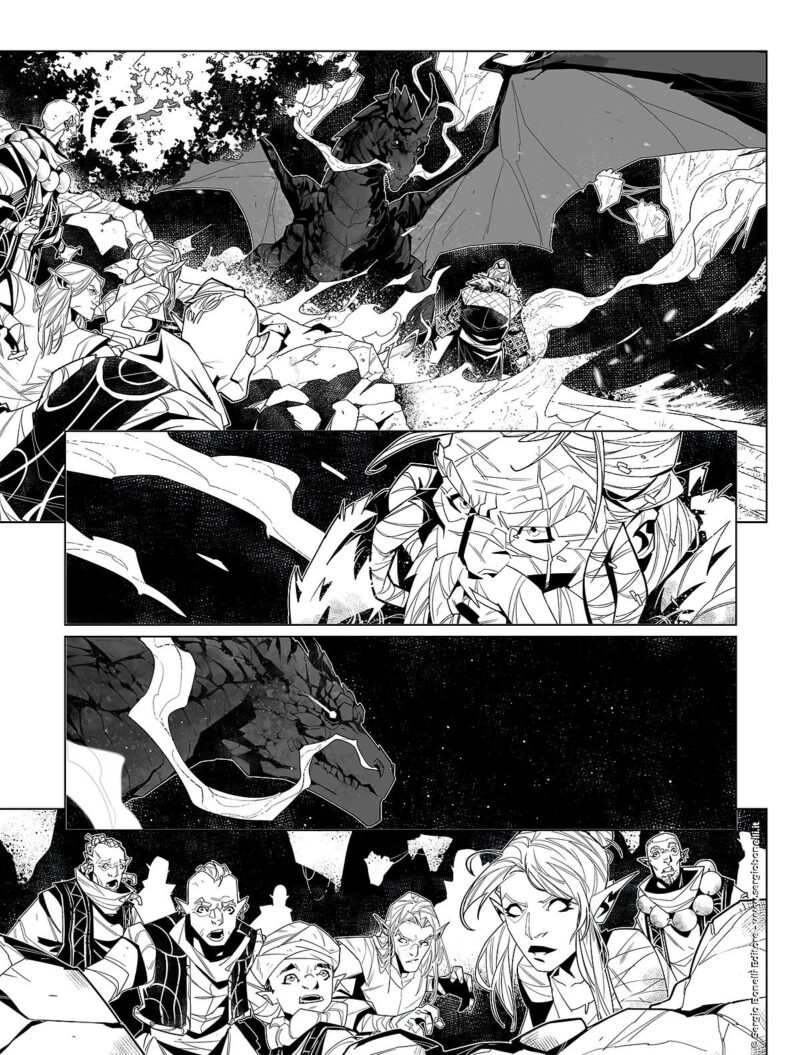 A completare l’opera, come nel precedente bis, tre disegnatori. Alessio Cammardella, già presente nel primo episodio, Denis Medri e Alessio Moroni, ognuno all’opera su un segmento di storia con i propri segni caratteristici ma che ben si amalgamo al fine di ottenere un’interpretazione omogenea. Il trio ha in comune una grande espressività nella recitazione dei personaggi oltre a un’ottima gestione delle componenti fantasy del racconto, in primis un enorme drago nero. Splendidi campi lunghi con scenari mozzafiato, piani ravvicinati dettagliati e intensi, un pregevole lavoro stilistico sull’abbigliamento dei numerosissimi personaggi e una costruzione della tavola dinamica, confermano l’alto livello dei disegni che caratterizza la saga di Dragonero.