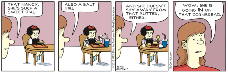 Elementi questi al momento totalmente scomparsi con la Jaimes, che è tornata a un approccio più tradizionale e per certi versi più fumettistico. La sua Nancy, infatti, ripete alcuni degli schemi utilizzati da Bushmiller negli anni d’oro della serie, come una sorta di “rottura della quarta parete” realizzato in maniera minimalista ma anche vicino ai tempi che viviamo.