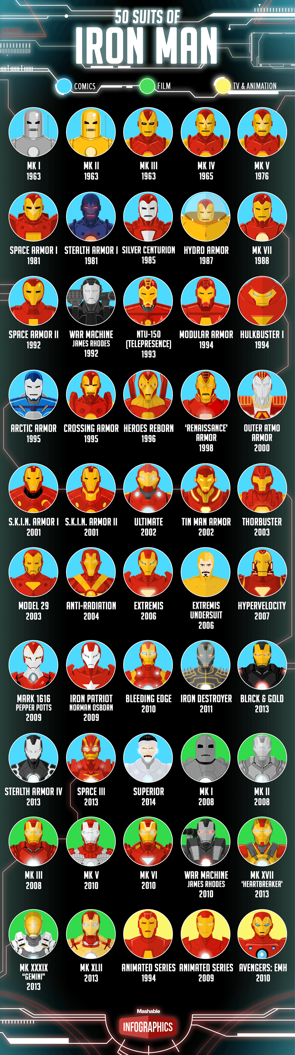 Maris WicksUn’infografica realizzata in occasione di Avengers:Age of Ultron da Mashable ci permette di fare un tuffo nel passato e di osservare tutte le armature indossate da Iron Man dalla sua creazione ad oggi. 50 anni di emozioni.
