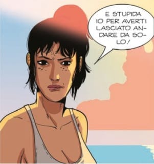 Ciò che segue invece sono pagine ben disegnate (su questo torneremo più avanti) nelle quali la giovane coppia spensierata resta tale nonostante i segnali che qualcosa non va sull’isola si facciano ben più che concreti: niente sembra traumatizzare eccessivamente i due che superano momenti anche molto difficili con un paio di battute e si scrollano di dosso una brutta avventura preparando una bella cenetta e leggendo un libro (e che libro) sulla spiaggia.