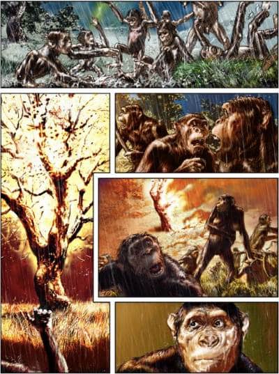 Il racconto in sé non brilla per enfasi, ritmo o capacità affabulatorie, ma trova il suo compimento e senso nell’arte di un Maestro come Tanino Liberatore. Con una unione di tecniche classiche e digitali l’autore realizza un’opera di stampo fotorealistico, dettagliatissima e curata, con uno stile che richiama le illustrazioni naturalistiche dalle quali si distacca per la dinamicità delle tavole e per la personalità del segno. Liberatore eccelle in queste pagine nella riproduzione dei personaggi, dei paesaggi e della natura: basta guardare le rughe sui volti degli ominidi, ognuno leggermente diverso dall’altro, la resa dei peli sui loro corpi, la definizione dei muscoli sui loro corpi asciutti, le pose con cui sono ritratti e soprattutto i loro sguardi, occhi lucidi che scrutano lontano in cerca di pericoli o di salvezza, che esprimono tristezza, rabbia, emozioni.