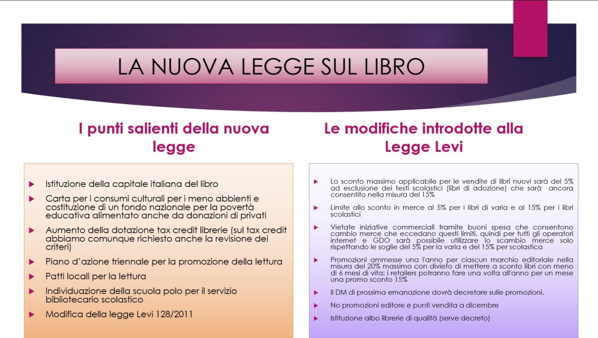Inizio con il dire che la riforma della Legge Levi, definita come Legge Piccoli Nardelli, non è solo lo sconto al 5%. “Purtroppo la legge” sento dire a tutti, “ha abbassato lo sconto”. La domanda che vorrei fare io: è davvero giusto che il libro sia l’unico bene sul quale si pretende lo sconto? Perché? Mi piacerebbe andare al supermercato e chiedere lo sconto sul pane, sul latte, sulle uova, ma perché non lo faccio? Un conto è avere prodotti in promozione per un tempo determinato, ma perché pretendere lo sconto 365 giorni l’anno? A cosa è servita la riforma della Levi? Nessuno ha mai guardato la Legge Piccoli Nardelli dal lato dei piccoli e medi editori, quelli che non possono competere con costi e quantità delle grandi catene che hanno sempre puntato sullo sconto come unico mezzo promozionale. I grandi marchi occupano, volenti o nolenti, il 90% degli scaffali delle librerie e lo hanno fatto uccidendo la piccola e media editoria. Dal 2011 al 2020, in 9 anni di Legge Levi com’è cambiato il mercato editoriale? Il Sole 24 ore ci racconta di un mercato che ha troppi prodotti editoriali e pochissimi lettori, allora perché si producono libri? E se non è possibile scoppiare la bolla editoriale, come si può intervenire? Forse favorendo l’eterogeneità editoriale? Forse con la “carta della Cultura” che assicura 100 € alle famiglie bisognose? Promuovendo la collaborazione tra istituzioni politiche e scolastiche e le librerie territoriali allo scopo di organizzare eventi dalle finalità culturali? Forse aiutando i giovani lettori con il “Bonus Cultura 18app” che seppur non parte della legge è ugualmente un importante incentivo?