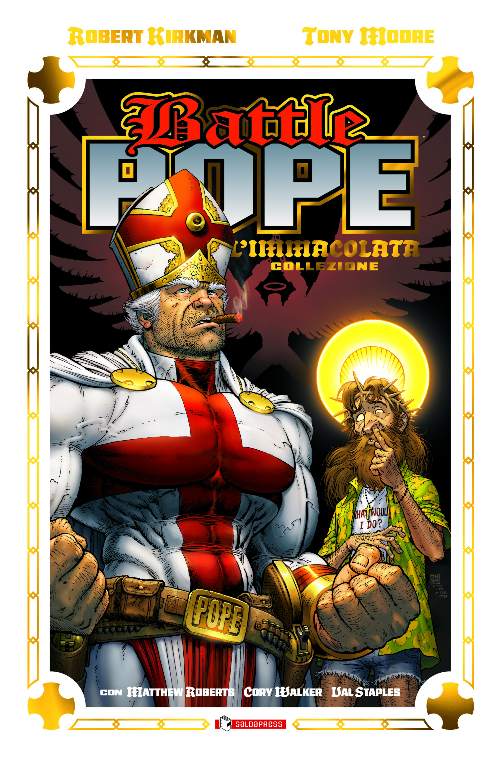 A 25 anni dalla sua prima uscita negli USA, arriva finalmente in Italia, e in anteprima per Lucca, Battle Pope: l’immacolata collezione, un’edizione omnibus completa delle storie divertenti e assolutamente sopra le righe con protagonista il “Papa guerriero” creato da Robert Kirkman per i disegni delle superstar del fumetto USA Tony Moore, Matthew Roberts e Cory Walker. Il Papa più irriverente ed eretico della storia del fumetto USA che lotta contro i demoni dell’Apocalisse che vogliono conquistare la Terra (e contro… Babbo Natale?) promette al lettore oltre 400 pagine di puro intrattenimento esagerato e dissacrante.