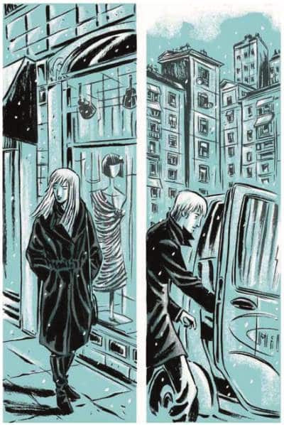 Il segno di Gabos si plasma su tavole in bianco, nero e azzurro, con un ampio uso di retinature che sporcano e a volte coprono quasi interamente le tavole per ammantarle di ombre e rendere più evidente anche graficamente la distanza tra i personaggi e il lettore, quasi a tracciare fisicamente una linea di demarcazione e sottolineare l’impossibilità di immedesimarsi e comprendere le loro azioni e la loro forma mentis.