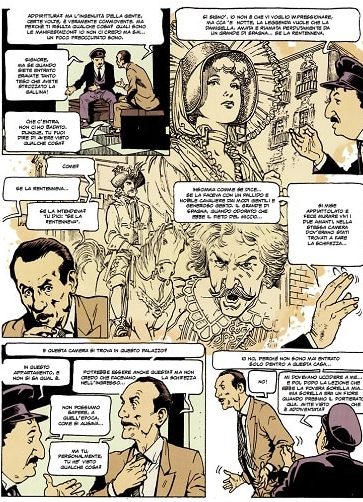 La colorazione di Ivan Cappiello si sovrappone bene a queste chine abbastanza forti, con colori leggeri, nelle varie gradazioni del seppia, del violetto, di un verdolino sfumato. Potremmo dire che la tenuità del colore contribuisce ad evocare la sensazione eterea propria di questa commedia eduardiana, giocata sull’equivoco spiritico – un’altra fonte presente nel testo, dello stesso De Filippo, chiarisce come l’elaborazione dell’opera gli sia stata ispirata dal reale ascolto di presunte sedute spiritiche.