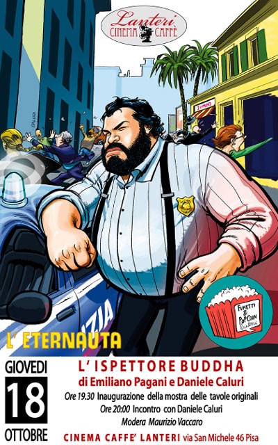Giovedì 18 ottobre, il Cinema Caffè Lanteri dedica il secondo incontro della rassegna Fumetti&Popcorn al dissacrante e irriverente duo del fumetto italiano, composto da Daniele Caluri e Emiliano Pagani e al loro nuovo fumetto L’ispettore Buddha pubblicato per Panini Comics. Alle 19.30 sarà inaugurata la mostra delle magnifiche tavole originali tratte dal fumetto e realizzate da Daniele Caluri, che alle ore 20.00 incontrerà il pubblico moderato da Maurizio Vaccaro.