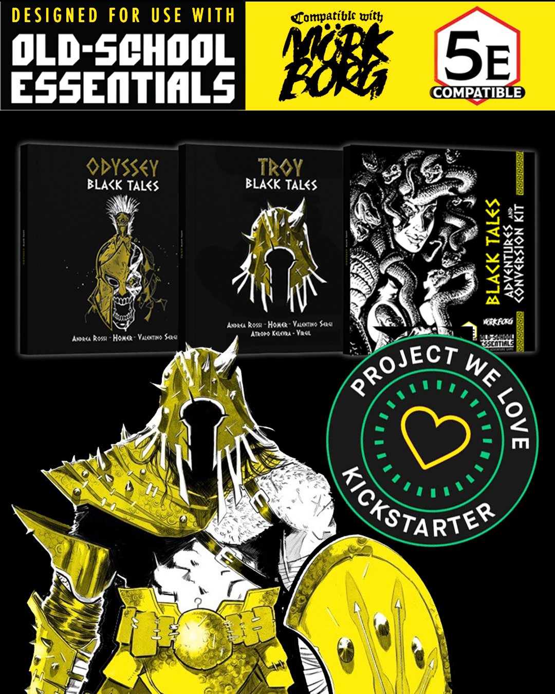 Tra i progetti di maggior successo dell’attuale ZineQuest, l’iniziativa di Kickstarter dedicata ai progetti indipendenti di Gioco di Ruolo di cui vi abbiamo parlato nello scorso articolo, sul podio dei più venduti troviamo Troy – Black Tales, nuovo progetto Officina Meningi scritto da Valentino Sergi e Atropo Kelevra, già firme dei pluripremiati Last Sabbath – il GDR delle Streghe e Totem – il GDR degli Spiriti, con il regolamento di Andrea Rossi, Master of Masters e curatore dell’edizione italiana di Old-School Essentials.
