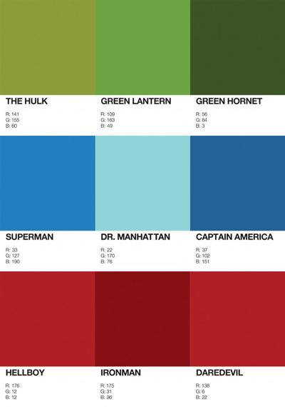 Sempre a proposito di colori, Stefano Torregrossa ha pubblicato un post davvero interessante su onicedesign.it, dal titolo Supereroi a colori, nel quale cita a sua volta Gidi Vigo, designer israeliano che si è cimentato nel distinguere il verde di Green Lantern dal verde di Hulk, domandandosi se il rosso di Iron Man e quello di Daredevil si assomiglino.