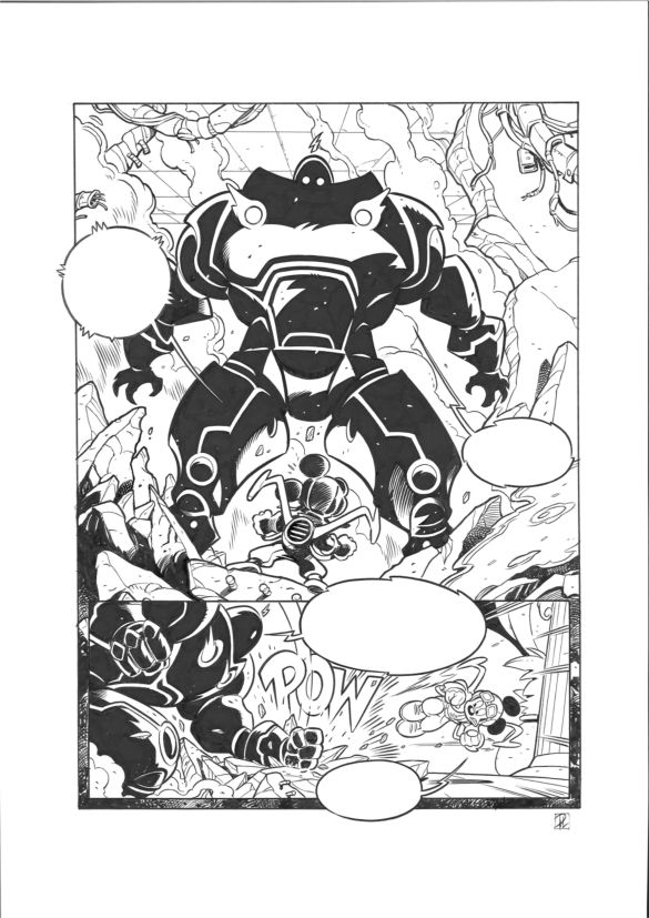 Credo sia una cosa naturale per qualsiasi artista evolversi, la cosa diventa sicuramente più difficile se si è un artista disneyano. C’è tutta una tradizione e una storia alle spalle che è impossibile da ignorare, quindi per quanto uno si senta innovatore bisogna sempre tenerne conto. Quando ho cominciato la mia collaborazione con Disney ( subito dopo la scuola di Carpi nel ‘94) cerano diverse possibilità oltre ai comics: lavorare sulle pubblicità oppure sull’oggettistica o sulle illustrazioni per i libri. Per accedere a questi lavori però lo “stile fumetto” non andava bene, quindi dopo una selezione si veniva mandati a Parigi ( in quegli anni c’era una sede Disney dove, tra l’altro, avevano prodotto il cortometraggio di Topolino Cervello in fuga) ad apprendere lo “stile d’animazione”, che serviva a rendere i personaggi più riconoscibili a livello internazionale. Fatta questa esperienza, per anni mi sono diviso tra questi lavori dalle diverse esigenze e questo a sicuramente influito nel mio percorso stilistico. Quanto detto poi va ad affiancarsi con quella che è stata la rivoluzione degli anni ‘90…PK! Avevo fatto solo due storie ai tempi, una della Giovani Marmotte a una con Paperino e Ciccio quando venni contattato da Ezio Sisto (curatore di PK, oggi vicedirettore di Topolino). Dopo alcune illustrazioni che finirono sul “PKalendario” mi affidarono “Trauma” . Per me che ero da sempre un cultore del supereroistico fu un invito a nozze…potei dare libero sfogo alle mie fantasie, a una regia diversa, ad un tratto più adulto. Fu una bella palestra, fatta di scadenze molto strette e qualità. Si lavorava sempre al limite delle possibilità umane…Così quando, ad un certo punto, sono tornato su Topolino avevo i “muscoli” pronti per affrontare Sua Maestà Mickey Mouse, cosa a cui tenevo particolarmente. Mentre su PK si poteva stupire con effetti speciali, qui c’era bisogno di rinnovarsi restando fedeli a quella fresca e leggera classicità che ha sempre contraddistinto questo settimanale, fatto di grandi artisti che nel corso degli anni alternandosi hanno dato un contributo a sviluppare questo magnifico universo disneyano. Ed è questo l’obiettivo a cui sto mirando in questi ultimi anni. Rendere onore a tutto questo costruendo però sempre qualcosa di nuovo. Quindi infine credo che il mio percorso evolutivo sia una somma di tutte queste esperienze, ma anche di quelle che devo ancora fare.