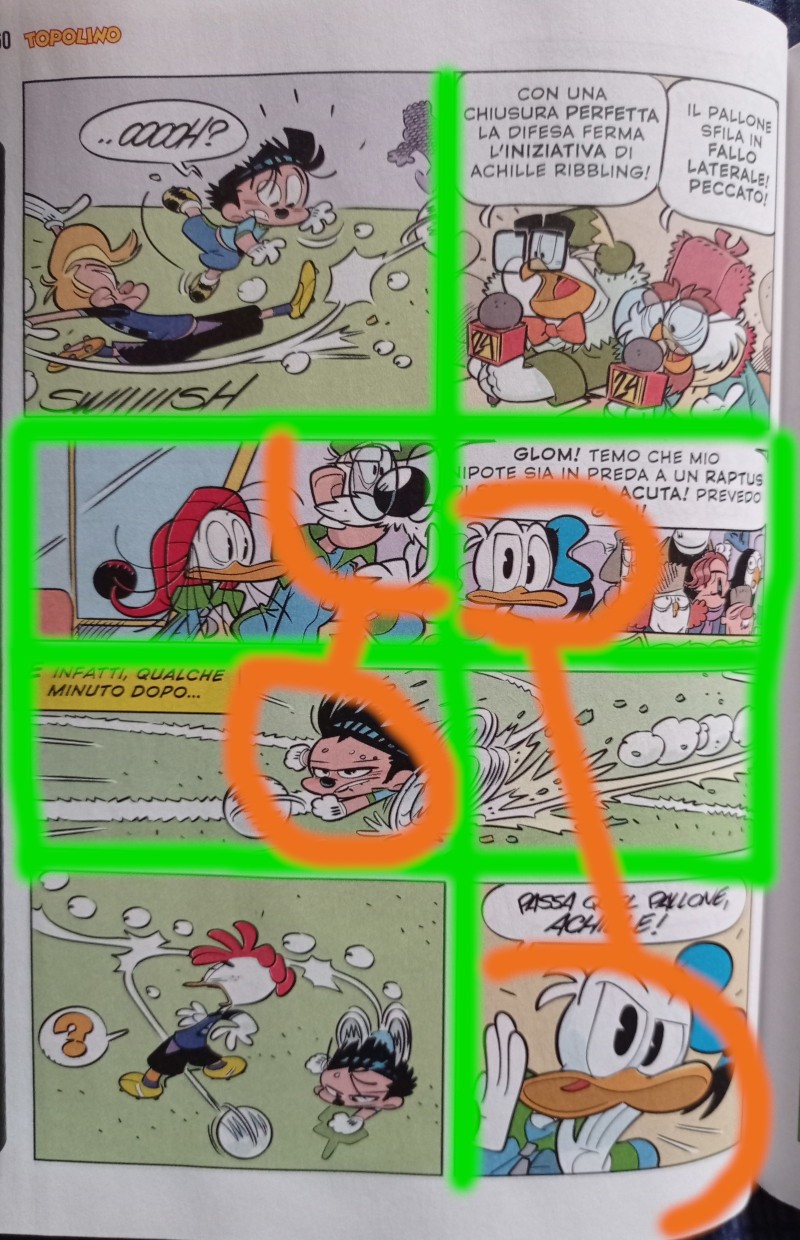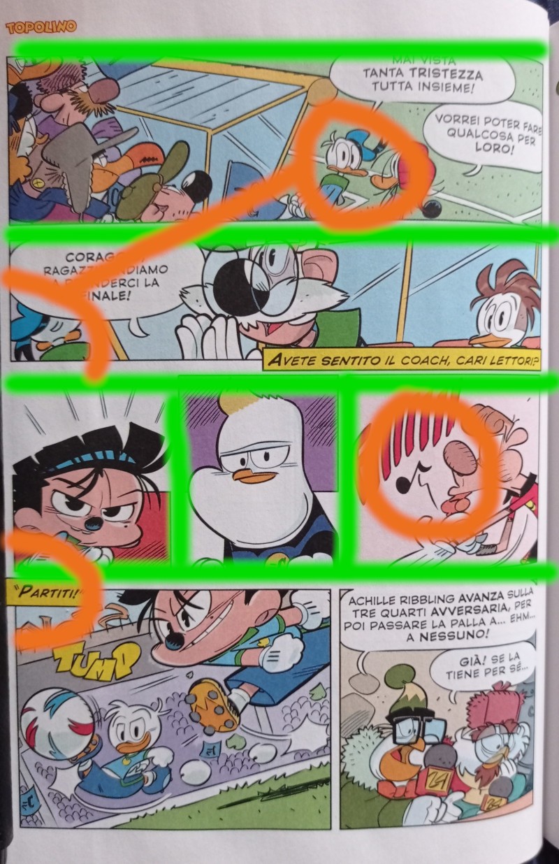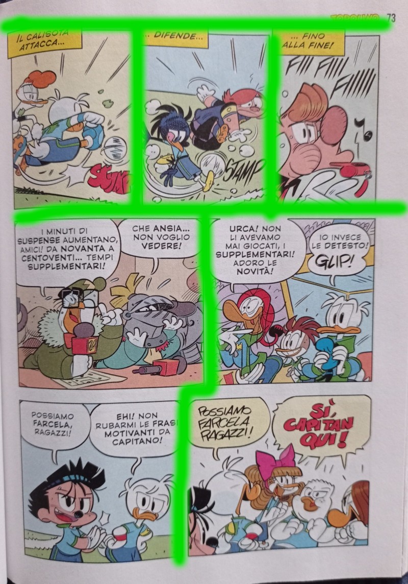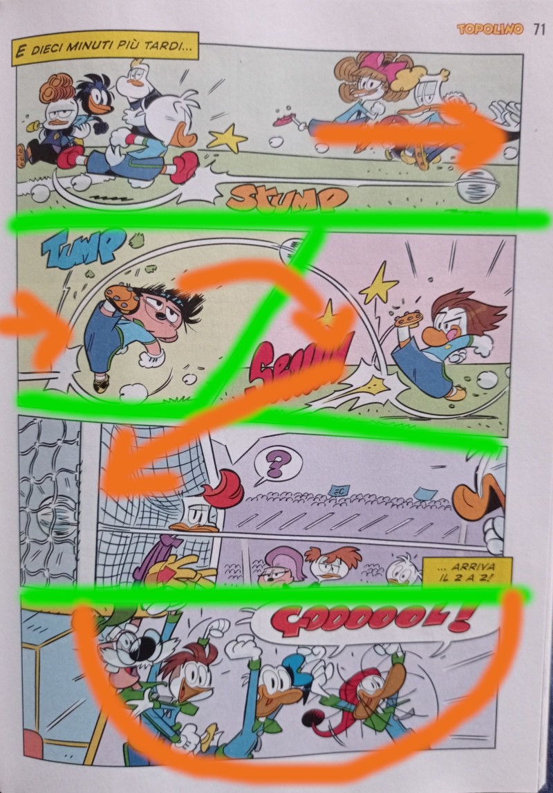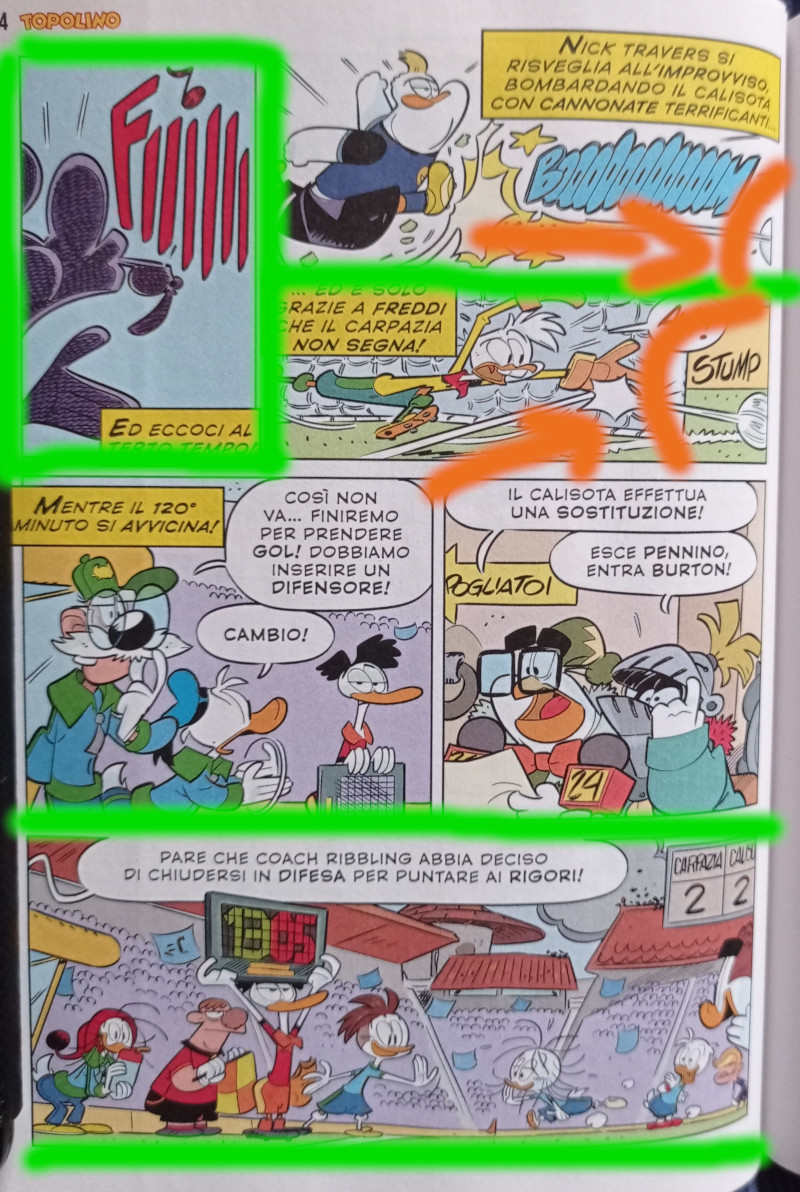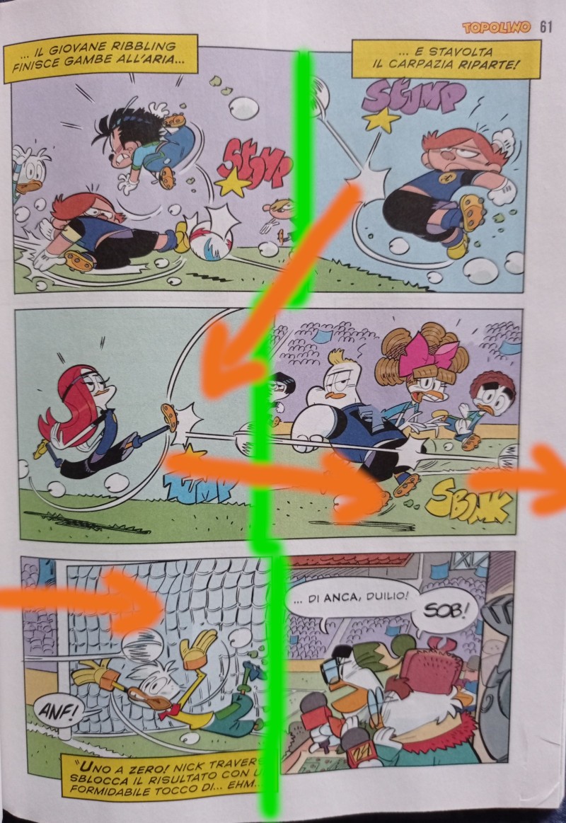 Vi invito infine a notare la complementarietà della prima e dell’ultima doppia: lo sguardo volitivo del nipotino, con il passaggio rasoterra deciso ma meno impattante del tiro in rete successivo, fa il paio con la conclusione dell’azione e la conseguente esultanza della panchina paperopolese, genuina e debordante.