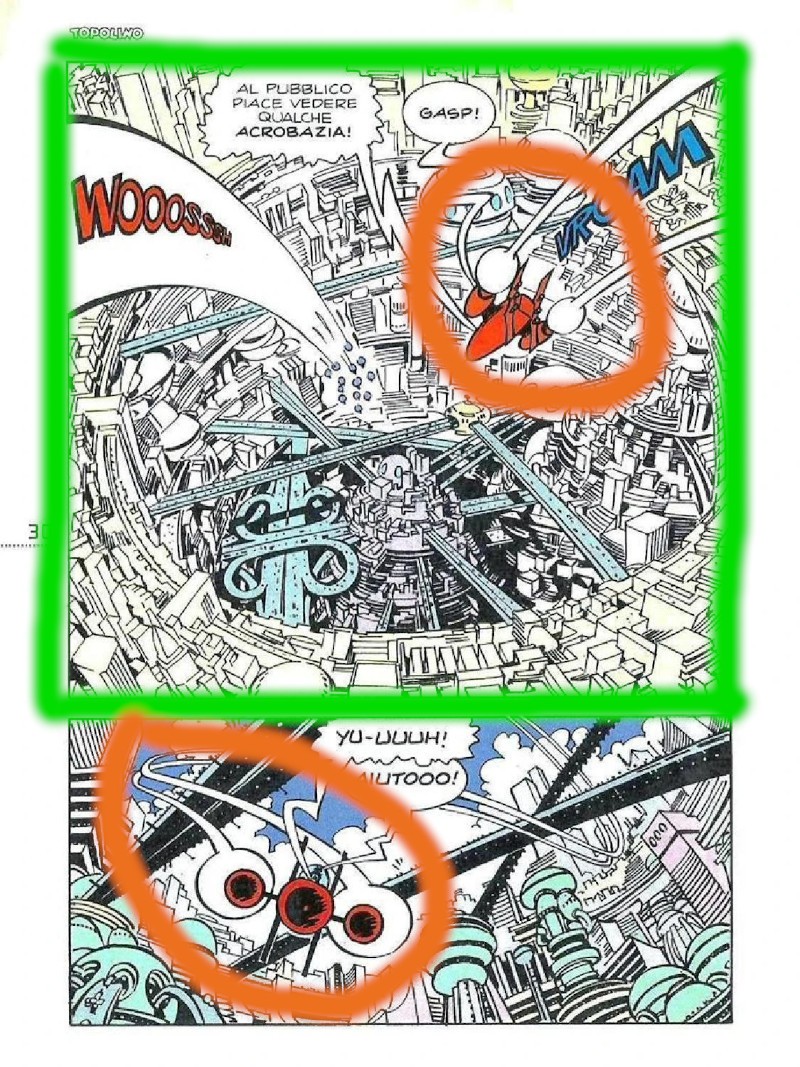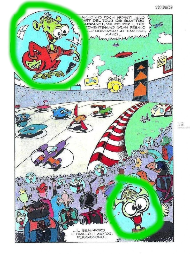 Non invasivo, ma al contempo ben presente nella tavola grazie al posizionamento nell’angolo in alto a sinistra e in quello in basso a destra, il buffo telecronista alieno che introduce la gara: i cerchi che lo contengono simulano peraltro l’effetto di quella specie di “sfera-schermo” olografica effettivamente a disposizione del pubblico sugli spalti.