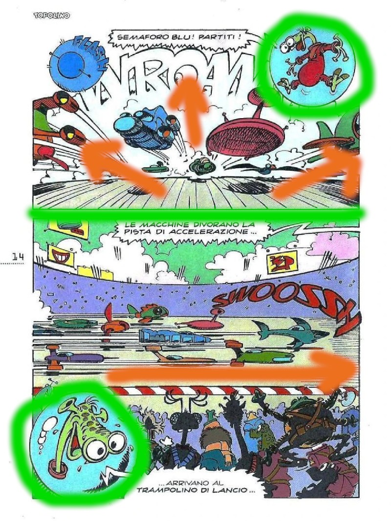 Ciascuno di questi riquadri è connesso direttamente con il successivo grazie a dei “canali” che suggeriscono il passaggio dall’uno all’altro; la freccia che viene disegnata nella vignetta centrale della pagina (sulla quale cade immediatamente l’attenzione del lettore), che punta direttamente su Dromo, crea un simpatico contrasto cognitivo nell’occhio del pubblico, che ha appena seguito il percorso in senso inverso e che ora è quasi invitato a ripercorrerlo al contrario.