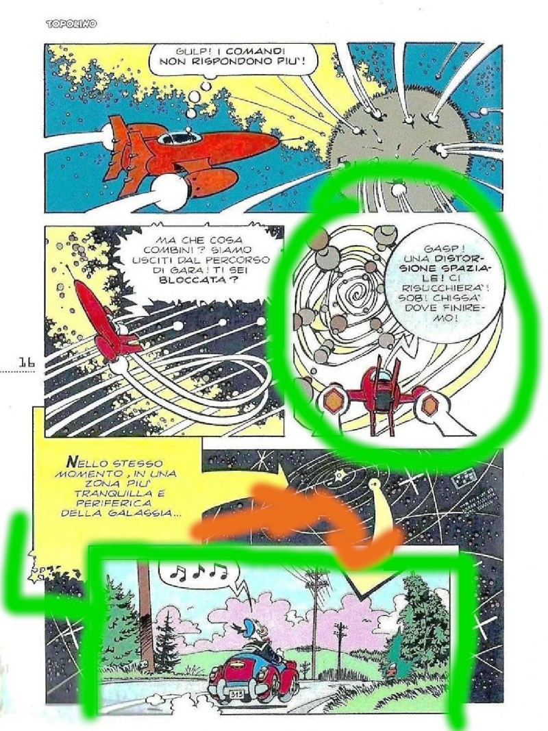 Si riprende infatti anche il sistema delle frecce “a vasi comunicanti”, stavolta per far vedere la Terra e da lì la statale su cui sta viaggiando Paperino a bordo della sua 313.