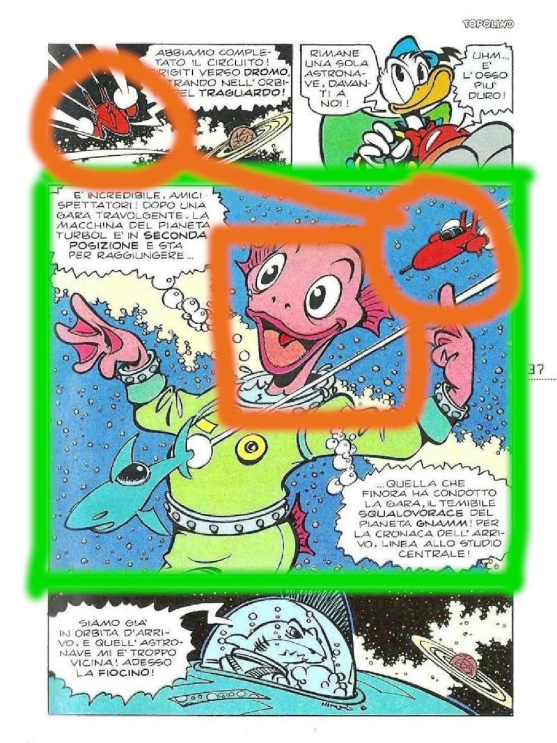 Gli spazi dedicati a Paperino sono ancora due tondi, uno nel quale il papero deve ancora riprendersi dagli scossoni di poco prima e uno nel quale guarda con un filo di preoccupazione il monitor della vettura. Come già per i cerchi nei quali compariva il telecronista, anche questi vengono collocati dal disegnatore negli angoli opposti della vignetta, a puntellare al meglio la cornice con due robusti punti di riferimento.