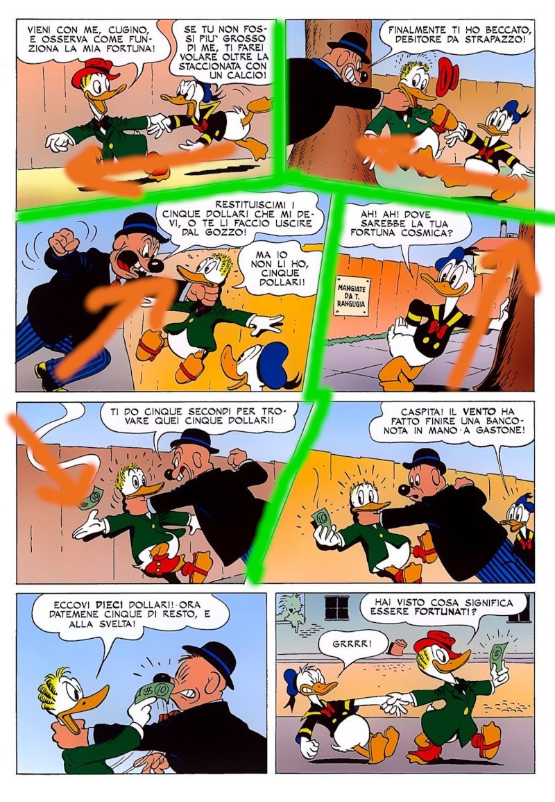 Innanzitutto si possono notare i bordi tra quarta e quinta vignetta, leggermente obliqui per rendere meno statica la griglia; inoltre anche i personaggi in scena seguono tale inclinazione, basti vedere la direzione verso cui si muove deciso Paperino nel terzo riquadro, lo slancio all’indietro dello stesso Donald nella vignetta successiva quando viene tirato per il bavero da Gastone e nel braccio alzato del cugino fortunato nell’ultimo quadrato della terza striscia.