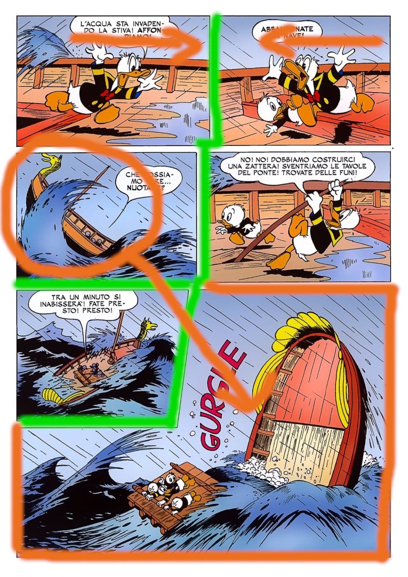 La scena è dominata dai marosi d’acqua, Paperino corre a destra e a manca – letteralmente: osservate le prime due deliziose vignette – e la nave si sta inabissando: notare in tal senso il passaggio tra il terzo riquadro e la semi-quadrupla finale, con il primo che riesce bene ad anticipare quello che sta per succedere all’imbarcazione.