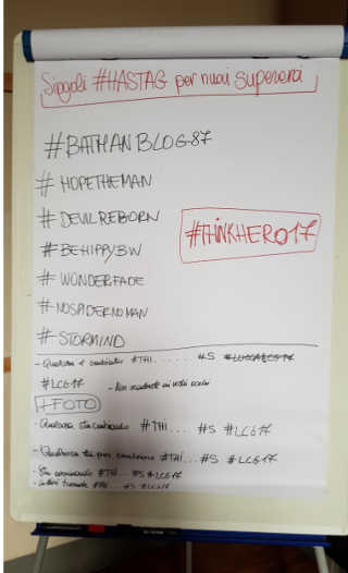 e. un hashtag che marcasse i messaggi sui social relativi alla nuova versione del personaggio. Da notare che in alcuni casi l’hashtag è diventato il nome del personaggio, mostrando come anche in un procedimento altamente compresso abbiamo la possibilità di sfruttare i risultati di uno step per migliorare quelli degli step precedenti. - Infine, con un’attività di brainstorming, abbiamo scelto un motto e una serie di hashtag per comunicare sui social l’attività svolta nel workshop stesso:
