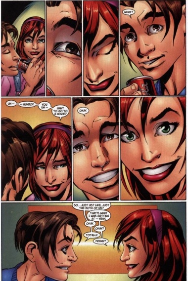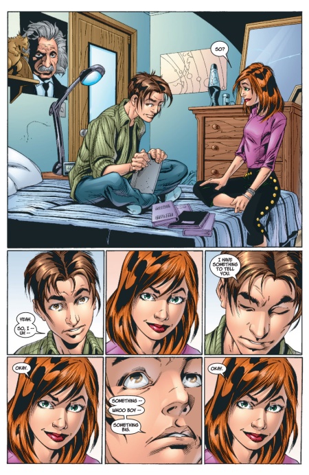 Jemas e Bendis guardano per esempio ai cosiddetti teen drama, in particolare al Buffy the Vampire Slayer di Joss Whedon, proponendo una vera e propria soap opera per teen-ager in salsa supereroica. L’attenzione principale è rivolta alla vita quotidiana dei personaggi e alle loro interazioni, con un forte gusto per il drammatico e con costumi, superpoteri e supercriminali a svolgere più che altro elementi di rottura negli schemi della “normalità”. Non è un caso, infatti, che tra gli episodi più riusciti ce ne sia uno (il tredicesimo, per essere precisi), il cui il costume dell’Uomo Ragno non appare neanche di sfuggita e la trama è incentrata sulla rivelazione da parte di Peter della sua identità segreta alla neo-fidanzata Mary Jane. La storia è ambientata per intero in un’unica stanza, con una logica quasi “teatrale” ma resta ugualmente dinamica, frizzante e gradevole, grazie alla bravura di Bendis nello scrivere dialoghi secchi e realistici. In un altro episodio, poi, Peter fa fatica a sgattaiolare dalla propria scuola a causa dei problemi di “routine” che gli si presentano a ostacolarlo, per affrontare il supercriminale di turno che sta mettendo a ferro e fuoco New York. L’azione, quindi, è spesso e volentieri lasciata in secondo piano, anche perché Bendis sembra non trovarsi particolarmente a suo agio con essa, perlomeno nel primo periodo (migliorerà nel tempo con il mestiere e l’esperienza): le scene d’azione sono spesso fiacche e ripetitive, infatti, mancando di quella grandeur presente nei fumetti di supereroi classici (e che fa difetto a molti autori contemporanei, a dire il vero).