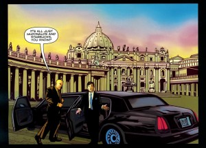 Lo story arc ambientato in Italia è da segnalare anche per un riferimento all’attualità inserito con bravura da Vaughan attraverso l’uso del flashback. La storia occupa i numeri 30-34 della serie e ogni albo si apre con un flashback che verte sul tema della religione, attraverso prospettive differenti. Il numero 32 inizia con un flashback in cui la Grande Macchina atterra sul tetto di un grattacielo dove un gruppo di persone sta praticando arti marziali. Il vigilante ha l’intenzione di prelevare uno dei presenti, colpevole di non essersi presentato a un’udienza che lo vede accusato per pedofilia. Ma il maestro accusa Hundred di aver violato un santuario e lo invita ad andarsene, difendendo sostanzialmente il suo allievo. Non è difficile vedere in questa sequenza un’allegoria degli scandali sugli abusi sessuali che hanno afflitto parte della Chiesa Cattolica statunitense.