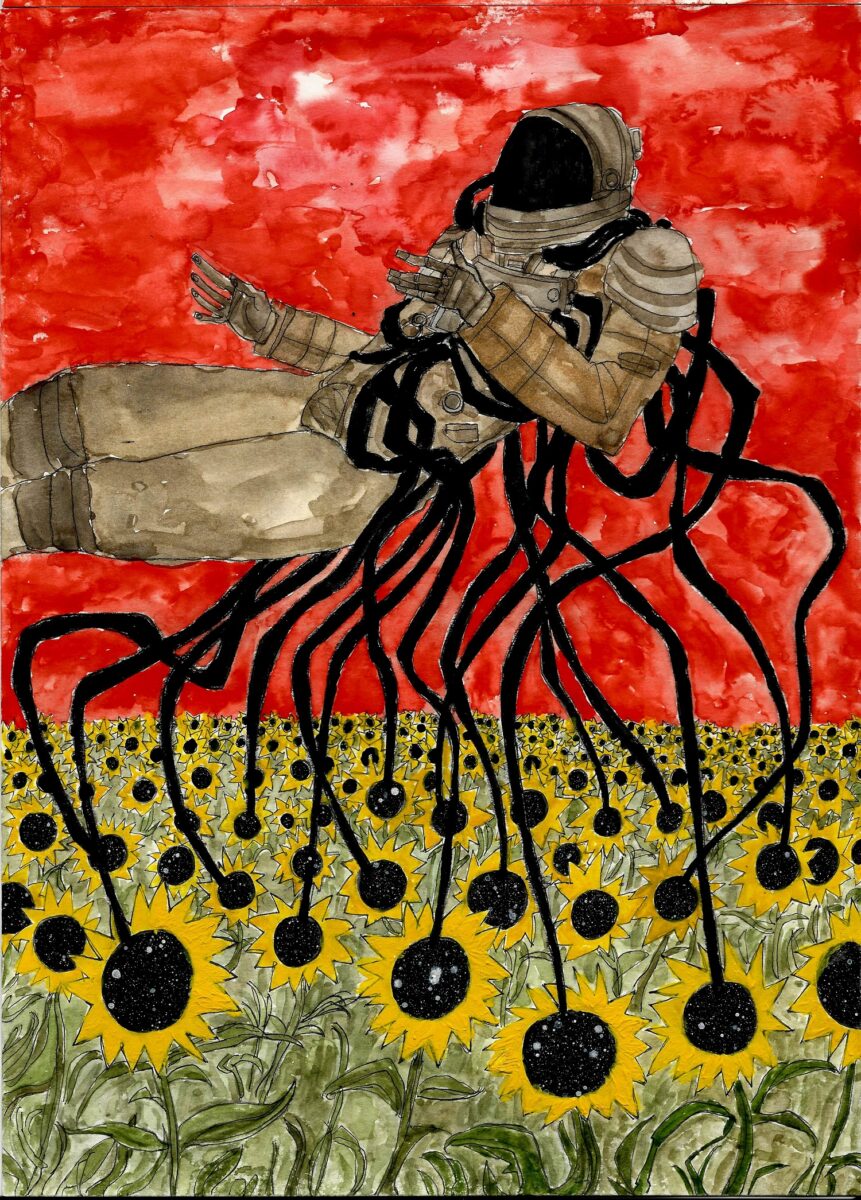 Siamo chiusi in tute ermetiche e guardiamo il mondo da una visiera scura. Una tuta ermetica che ci impedisce il tatto, ci nega di essere raggiunti dal calore di un’abbraccio o essere rassicurati da una carezza. Siamo sospesi in un limbo che porta in sé l’infinito. Da una terra che ci ha maledetti ma che ci tiene ancora sospesi in vita – Manuel Galeotti